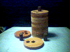 穴のあいた12枚の円盤と円盤3枚分の厚さに相当する13本の棒があって,その円盤を積み重ね,その間に13本の棒全部をきちっと収めるパズルです。