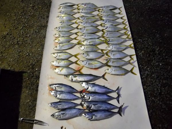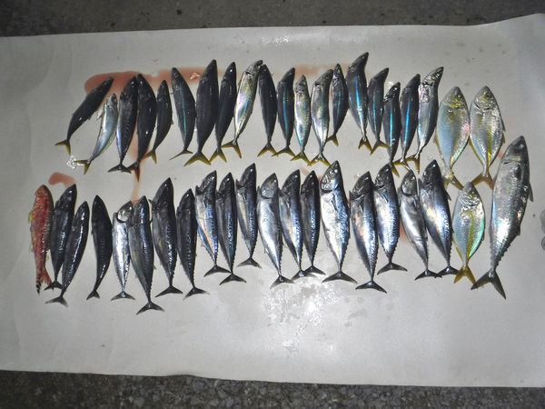 悪天候が多く予定合い急遽船釣りへ。 絶好の釣り日和、最初のポイントへ早々にシマアジ釣れ、その後反応が無くなりポイント移動。 釣り始めてメジカが直ぐ釣れ強烈な引きを楽しみ、すぐ次が来たがハリス切れ、傷が有れば直ぐ手入れ要です。 やがて暇な時間がにて帰港を兼ね最初のポイントへ、シマアジが良く釣れ時間前に納竿。 釣果:シマアジ34匹、大サバ1匹,メジカ(スマ系)8匹、2+2+2h