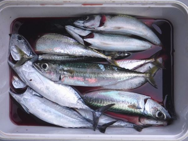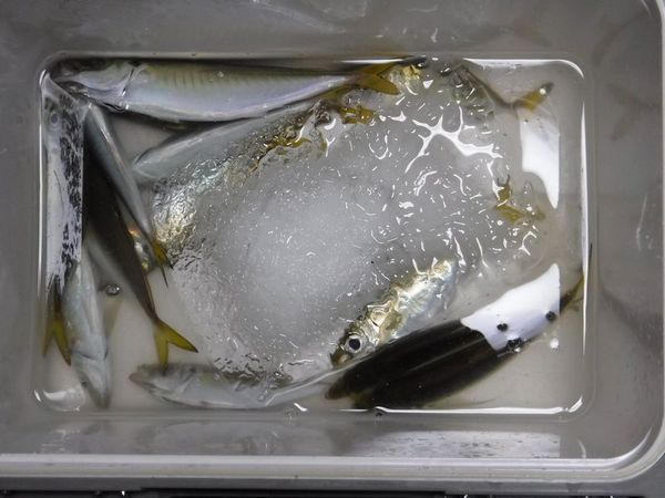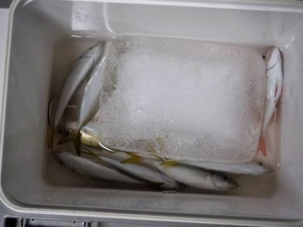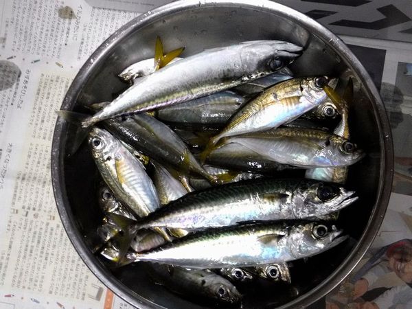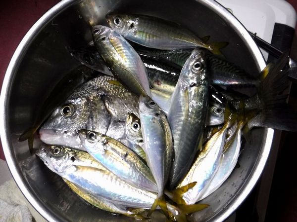 釣果:ムロアジ4匹,イサギ1匹,シマアジ5匹,ハマチ1匹。